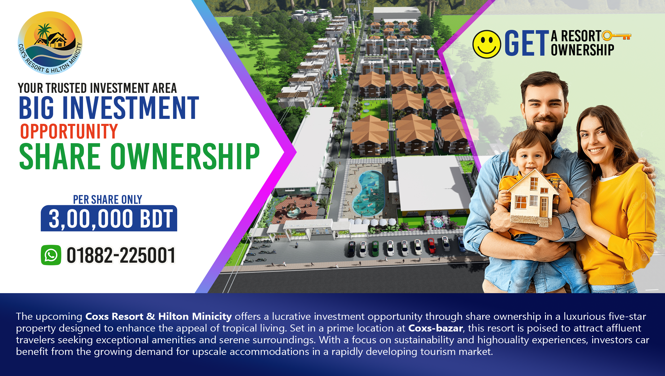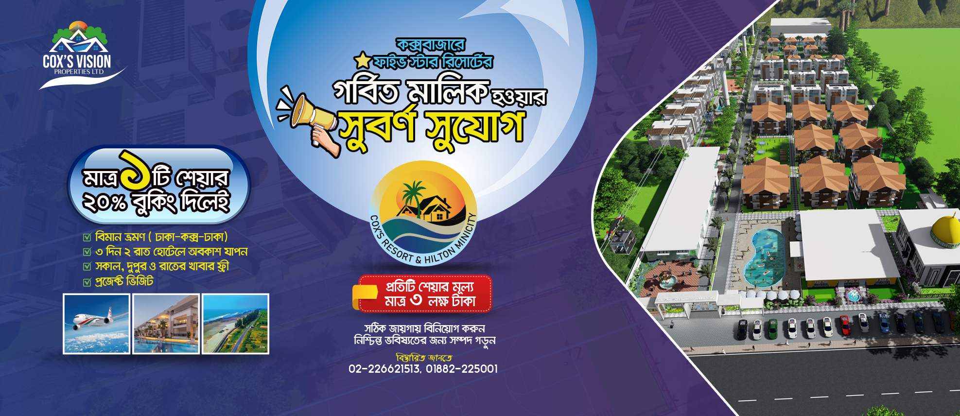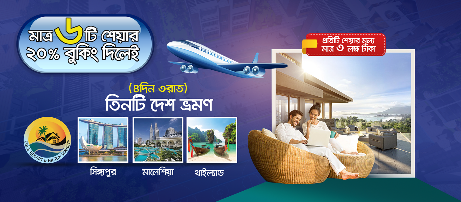 Cox’s vision Properties Ltd. Is a Real Estate Development Company developed in Bangladesh, focusing on creating Premium Residential and Commercial Properties, Hotel & Resort. One of our notable Project of this Company (Share Ownership) is a Five Star Resort named “Cox’s Resort & Hilton Minicity” is distributing public share to general people and side by side inviting Investors to Invest. We are enriched with 15 years of experiences in Hotel & Resort Business. Hence we are driving our Client, Partners & Investors toward a Profit and Growth world. Our ambition is to provide a lifetime Halal Income for respected Client/ Partners/ Investor. We also Build & Develop world class Hotel and Resort all over Bangladesh in the Tourism Sector and hence we are contributing to our beloved Modern Bangladesh.
